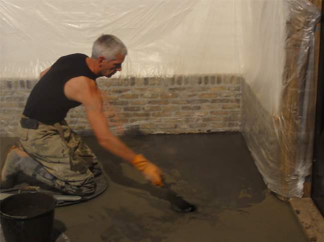 De start van de realisatie van een gepleisterde cementdekvloer met toplaag kleuring zwart/antraciet te Raamdonkveer. Robuuste en natuurlijke betonlook.